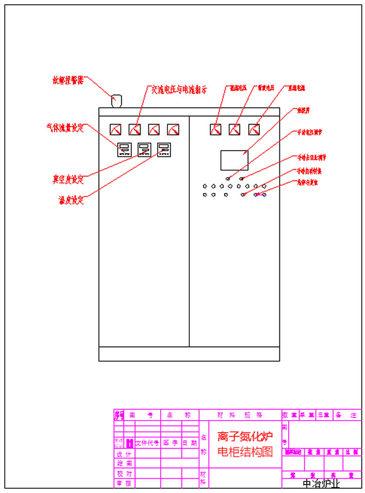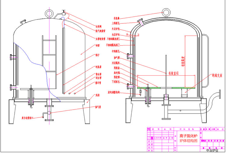 真空氣體氮化爐是由鋼板做成筒狀外殼,里面是由定形的標(biāo)準(zhǔn)耐火磚砌成的加熱工作室,在加熱室和外殼之間填滿(mǎn)了保溫材料。加熱室中有一不銹鋼焊接的密封爐罐,爐罐上部裝真空橡膠密封圈,下部為水冷套,爐蓋頂部裝有均熱風(fēng)機(jī),保證了爐內(nèi)氣氛的均勻。