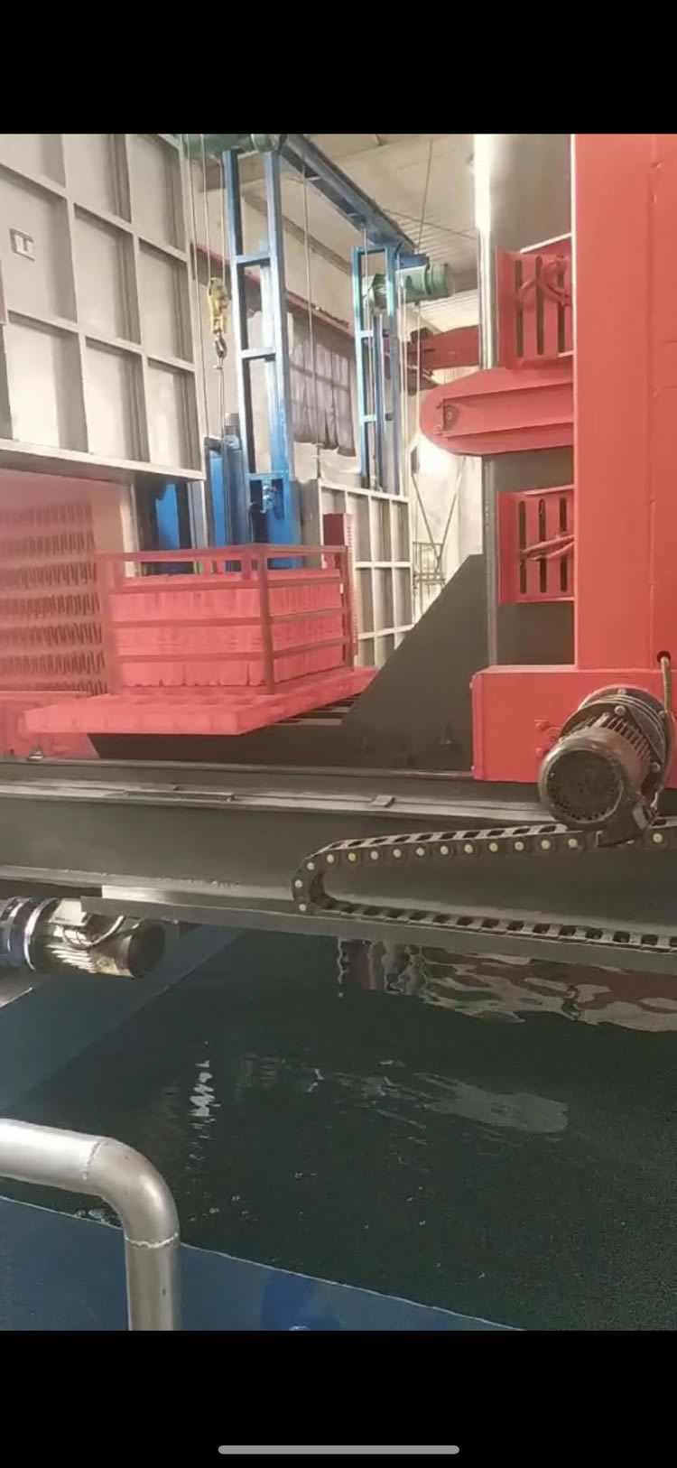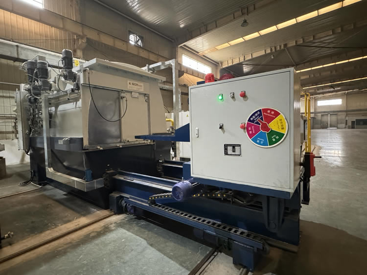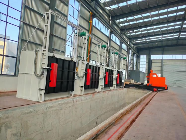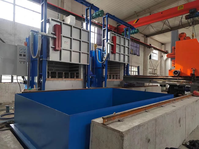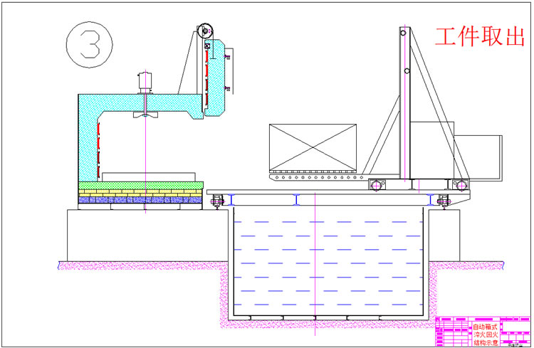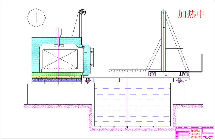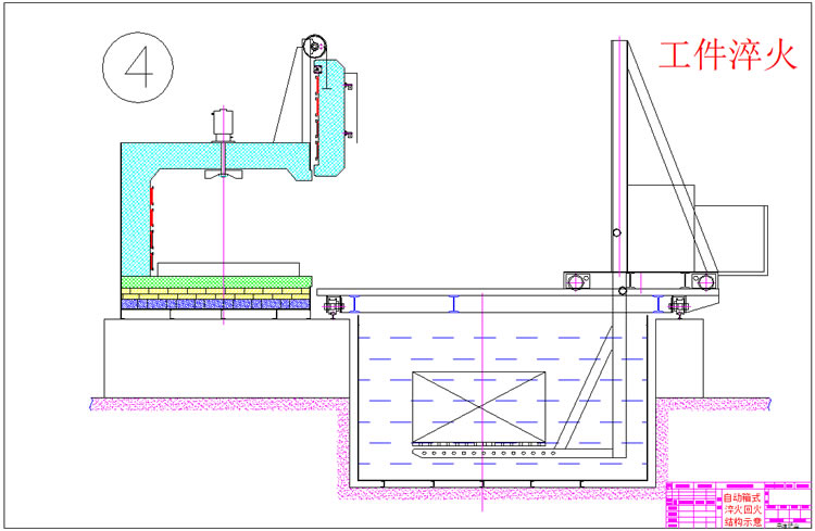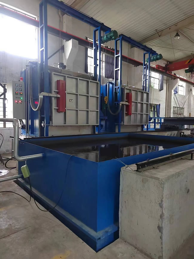3、出爐淬火:按動出爐按鈕——中轉車移動到淬火爐爐口——爐門開啟——中轉車把工件移出爐膛——中轉車后退——升降叉下降,工件進入淬火介質——中轉車帶動工件在水中左右擺動(次數可調)——中轉車上升瀝水——淬火工作完成