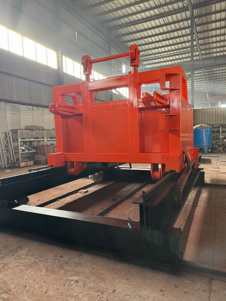 2、淬火裝爐:把料筐吊到裝料平臺上(只需要操作一次)——人工把工件裝入料筐(需方自備)后——按動放料按鈕——中轉車從裝料平臺上叉取料筐上升50mm——中轉車后退——中轉車移向淬火爐位置——淬火爐門開啟——中轉車把工件送入爐膛——中轉車自動退出——爐門關閉——加熱爐啟動加熱——裝爐工作完成。